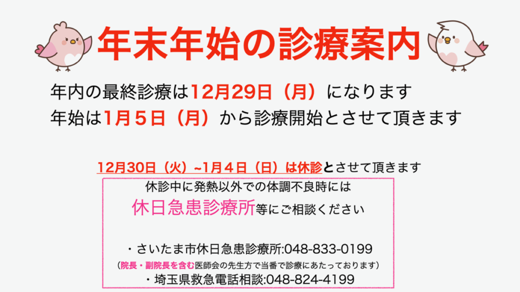 12月30日(火)~1月4日(日)は休診とさせていただきます。